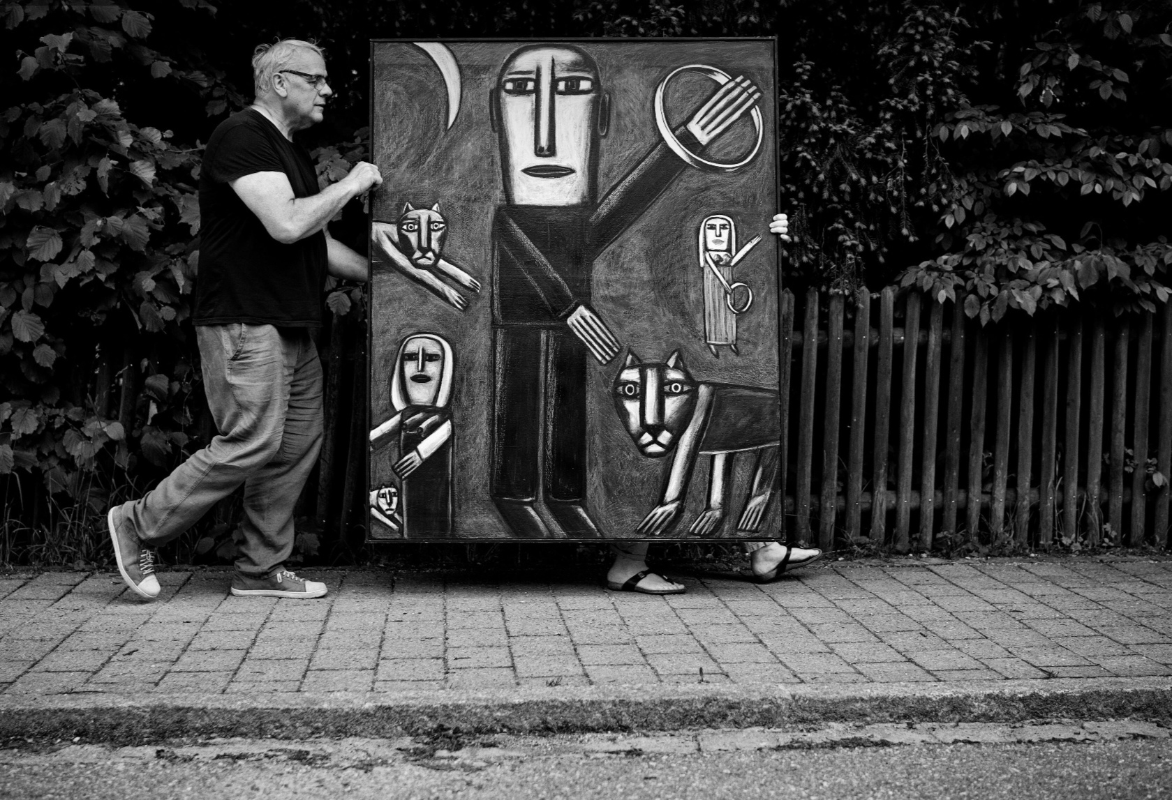 „Kunsttransport“ (2021): Der Künstler und Kurator Harry Sternberg mit einem Bild des Uttinger Malers Hans Dumler